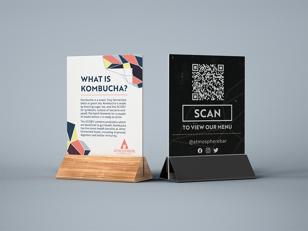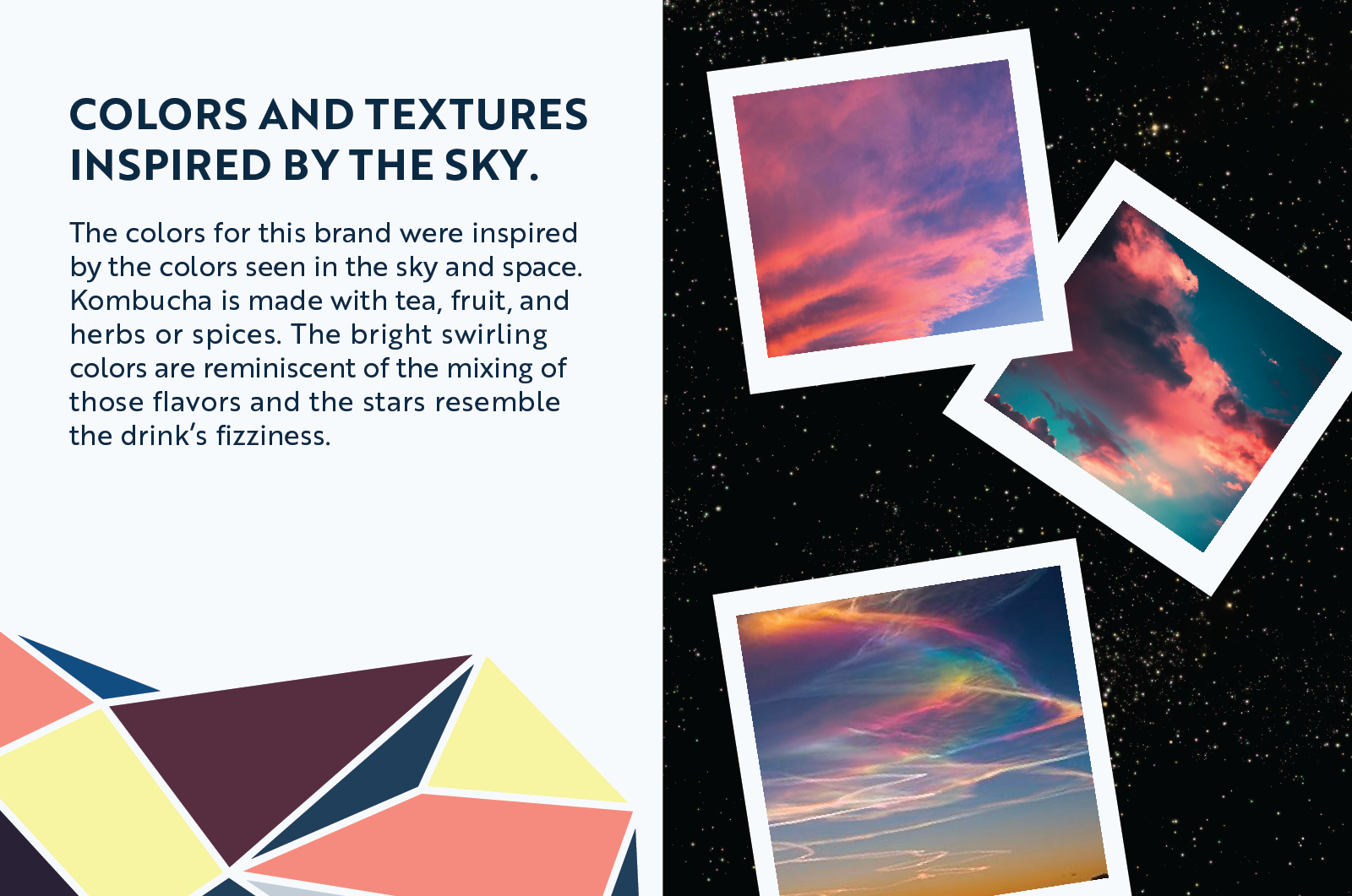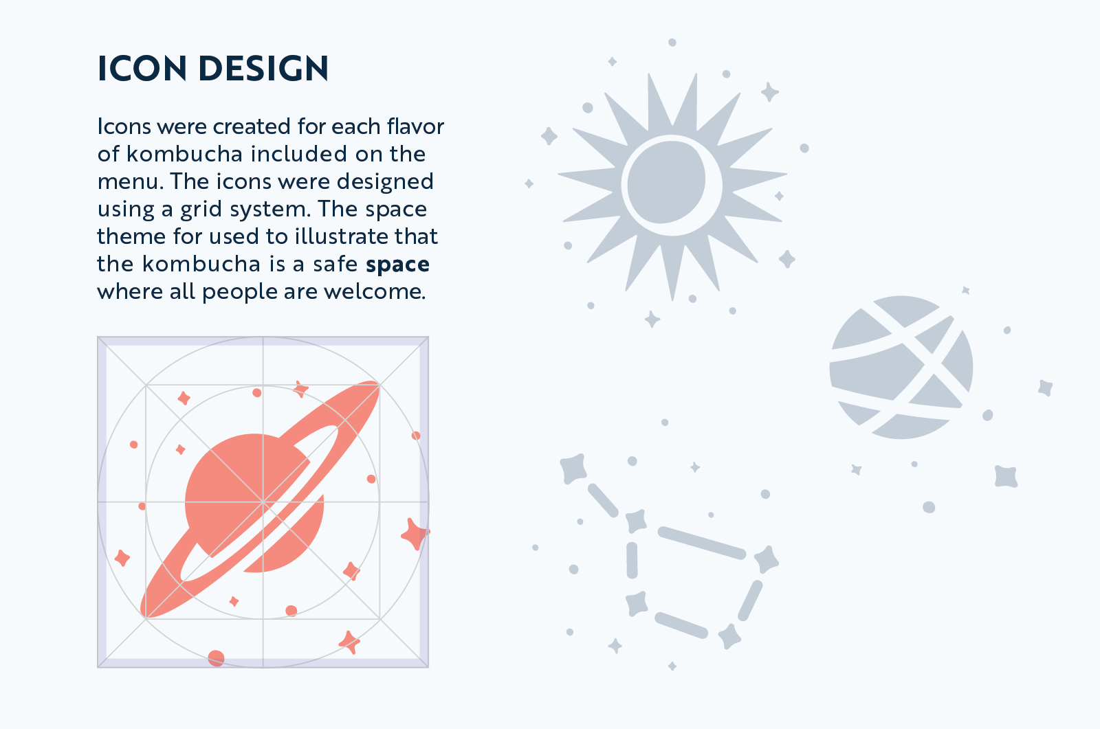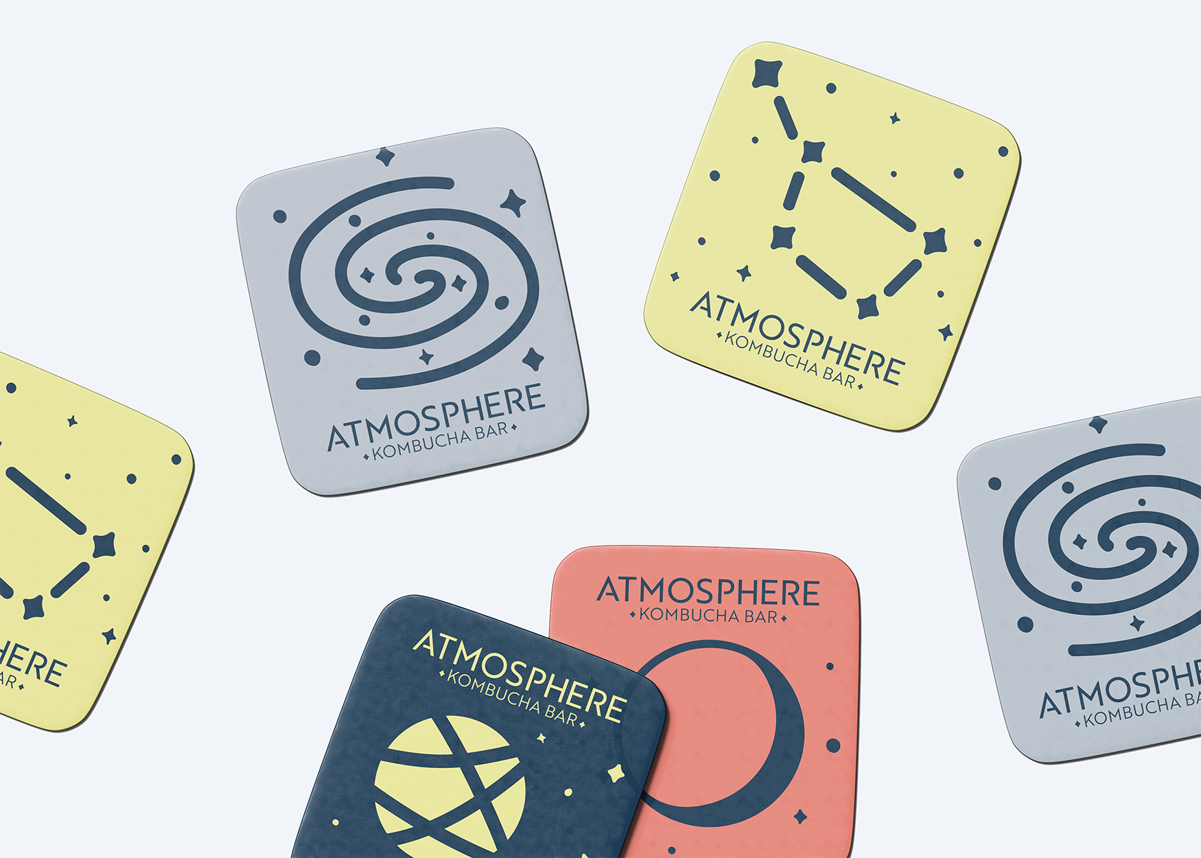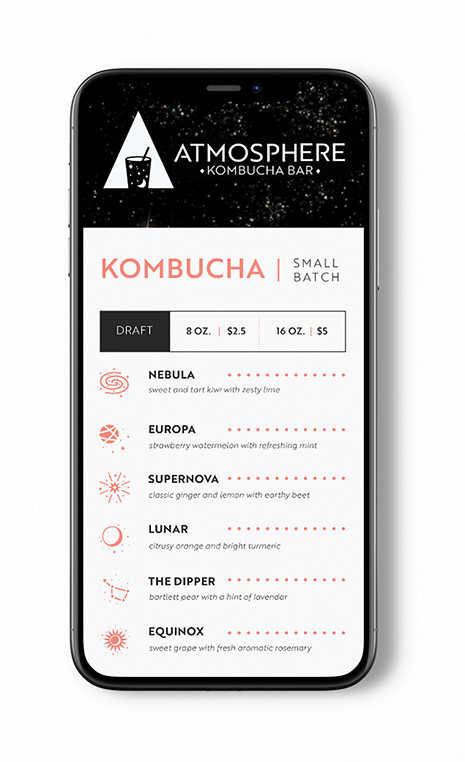 The concept and menu design for Atmosphere Kombucha Bar uses a space theme to connect the brand materials. The branding mirrors the safe, entertaining, and relaxing environment of the bar. The audience are individuals who would like an alcohol-free place to socialize and are health conscious. The goal of this branding project was create an original concept to showcase typographic elements.
